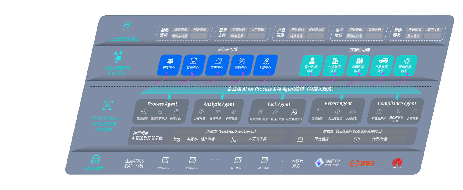 端到端的一站式AI工作空间深度融合了从企业战略规划到日常经营的全流程业务板块,,,,定向解决车企内部领域多、、、部门多、、、链条长、、、、场景碎片化等难题,,支持车企快速构建以AI为核心的生产力写作体系,,,,实现任务执行与AI能力的无缝集成与交互