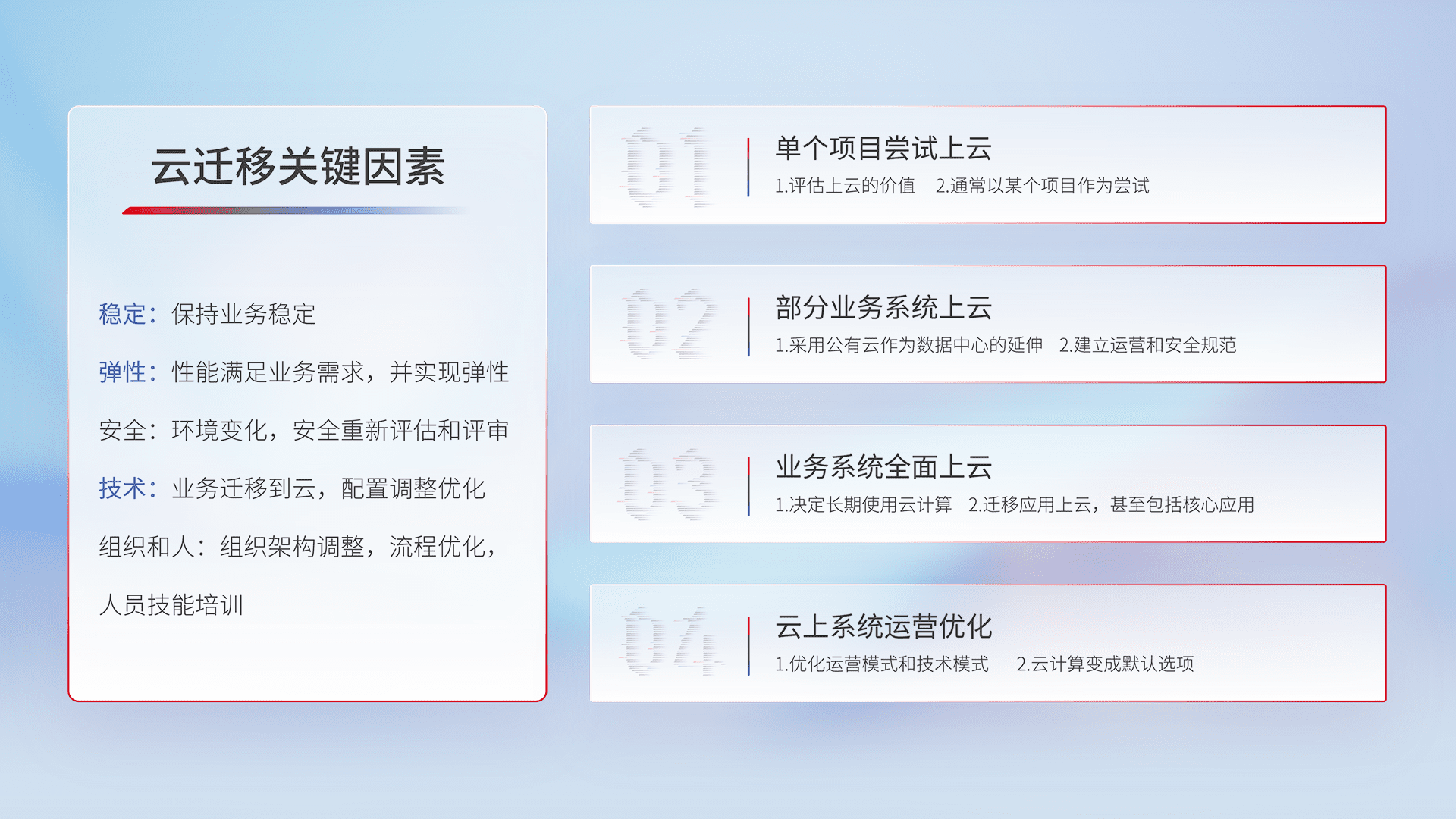 结合实际业务,,,,从规划设计、、、云平台选型、、云原生改造、、、数据迁移、、、集成交付,,迁移全过程为客户识别最佳上云路径,,,做好风险识别管理,,,设计网络架构、、、身份权限、、、安全审计合规、、、操作审计、、、日志审计、、监控告警策略、、、、多站点容灾设计等,,,,对云上基础设施进行整体规划,,,提升IT治理水平,,以满足弹性、、高可用、、高性能的需求。。。