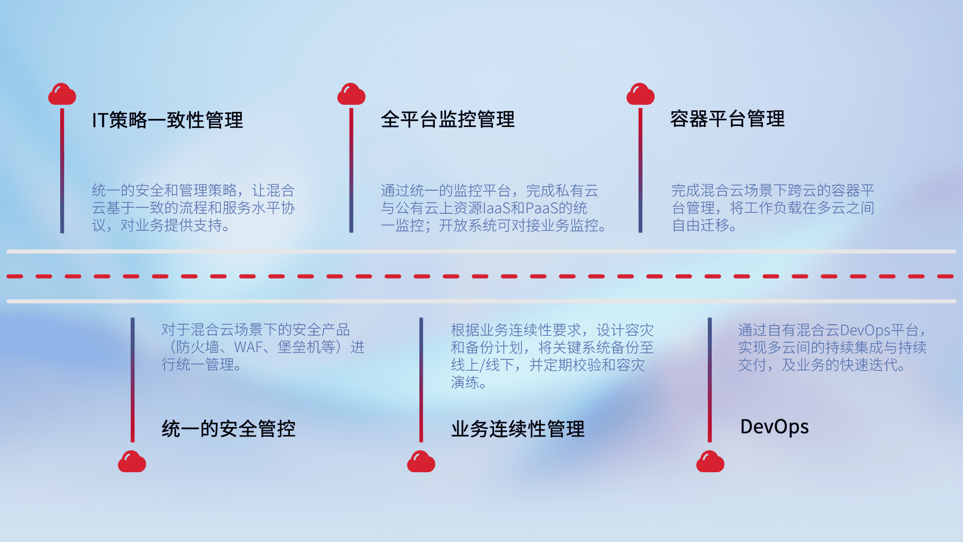 通过多云纳管,,以统一的资源数据模型把客户的云资源进行抽象和封装,,,,进而实现对多云资源的统一操作,,,保障云资源管理的可靠性、、稳定性与可用性。。。。量身定制化运维内容,,配置、、开发运维、、补丁管理、、备份、、、监控、、认证和访问管理、、审计和日常巡检等,,,,保障在用云过程中的可靠度,,稳定度以及高可用率。。。。