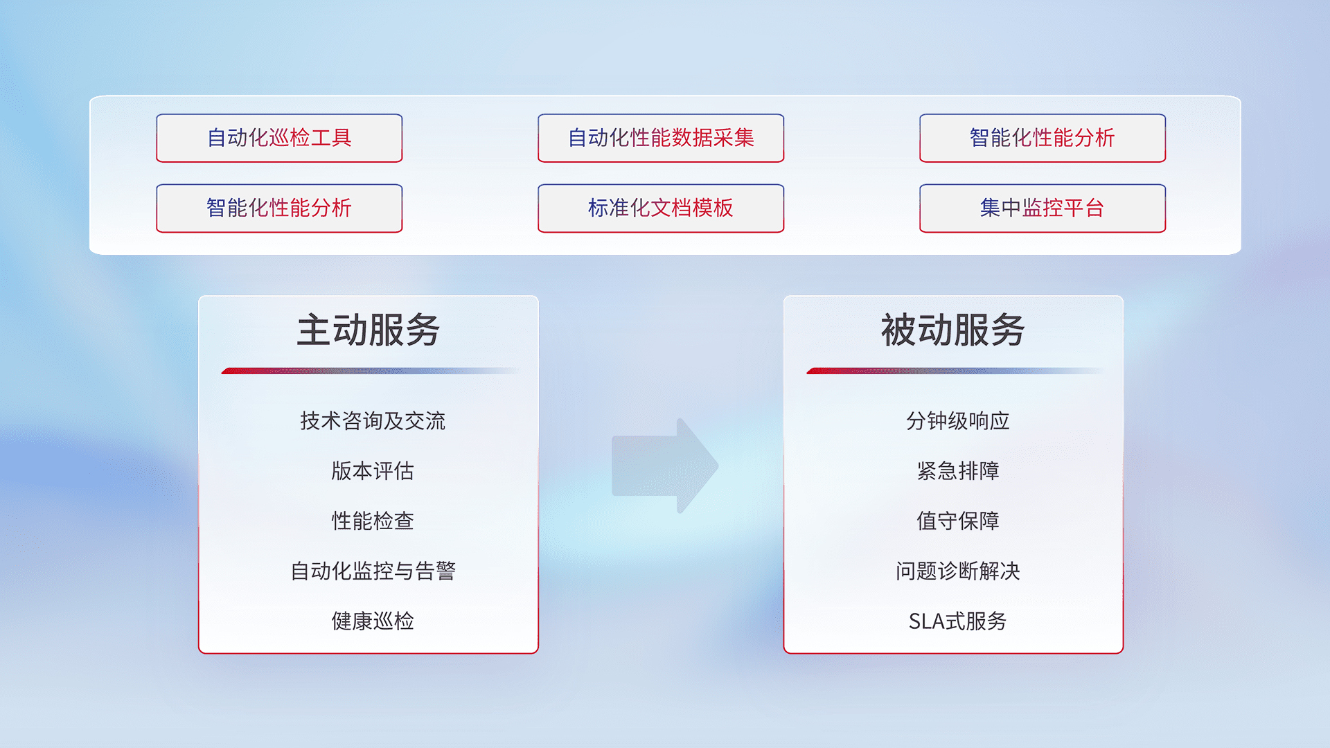智能化工具和标准化文档,,,保障服务质量,,,,提供主动服务(包含技术咨询、、、版本评估、、、性能检查、、、自动化监控与告警、、、健康巡检)和被动服务包含(分钟级响应、、、、紧急排障、、、、值守保障、、、、问题诊断解决、、SLA服务)。。